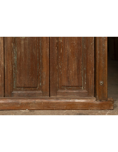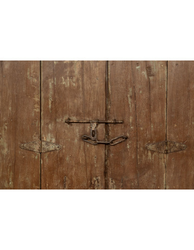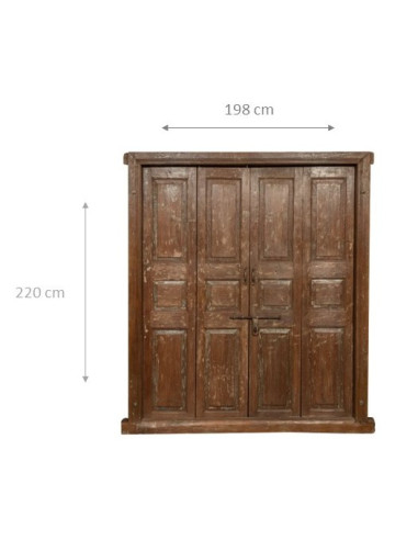 Старинна врата от масивно тиково дърво с размери дължина 198 см, дълбочина 15 см, височина 220 см. Тази врата произхожда от разрушаването и възстановяването на важни стари сгради. Фино реставрирана и обработена за външна употреба, всяка врата е част от истински и уникален антиквариат. Всички измервания се отнасят за максималните габаритни размери на изделието.