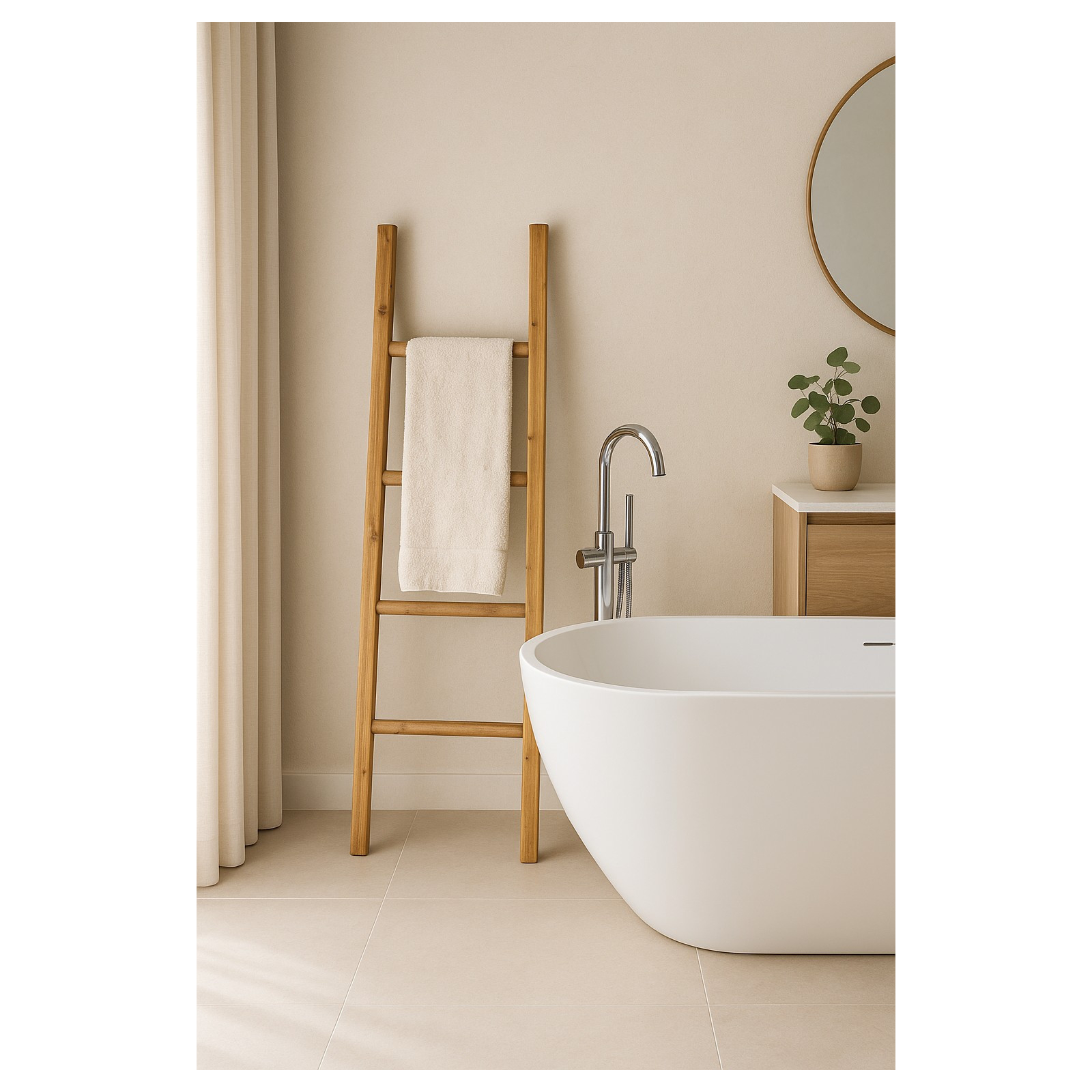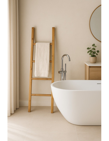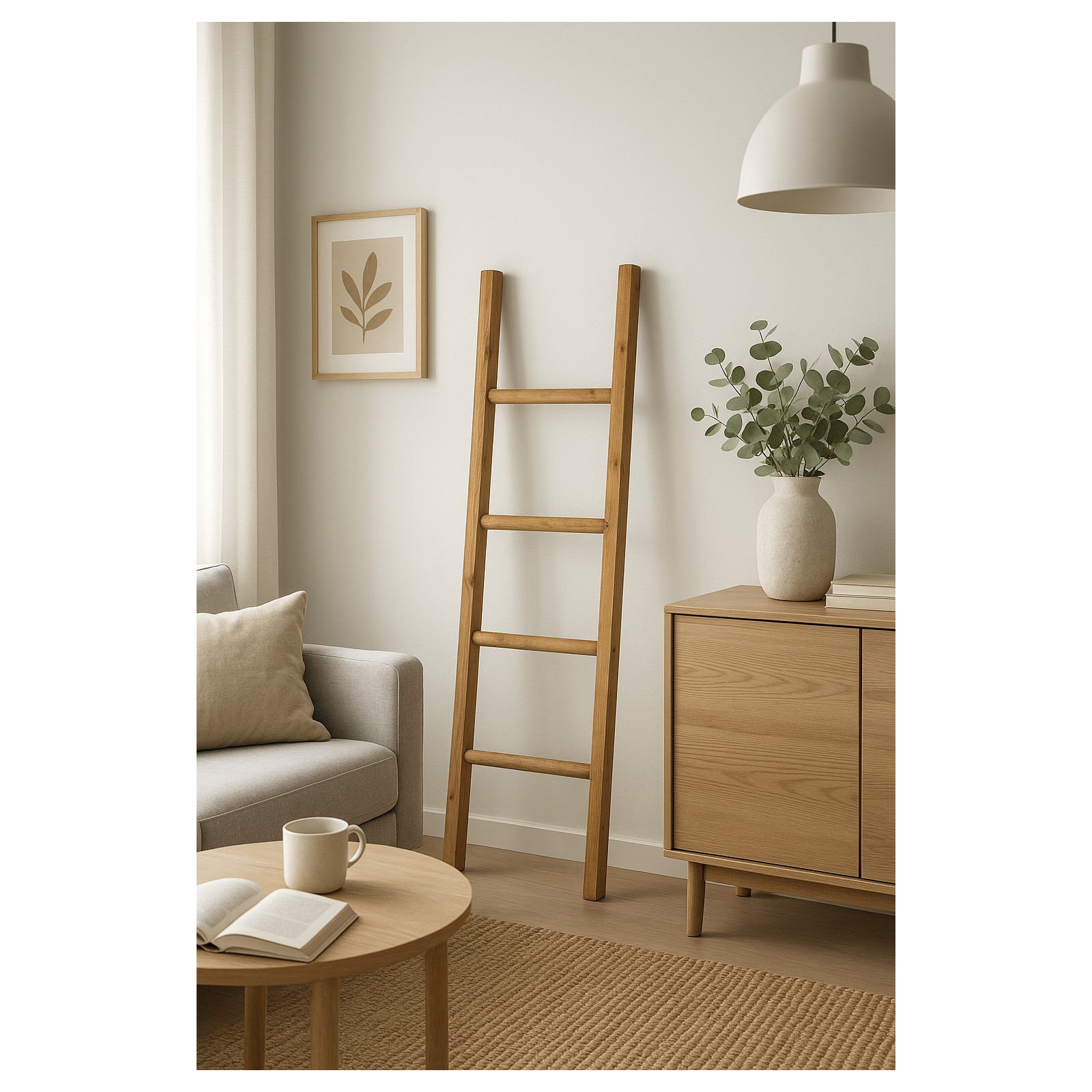 Дървена стълба за бани, която възпроизвежда точно старите стълби както по отношение на естетиката, така и по отношение на конструкцията. Многофункционален аксесоар за обзавеждане, както и функционален инструмент за ежедневието. Тъй като са изработени ръчно, всяка стълба може да се различава леко от другата по отношение на финишното покритие. Размерите на стълбата са височина 130 cm, ширина 35 cm и дълбочина 4 cm.