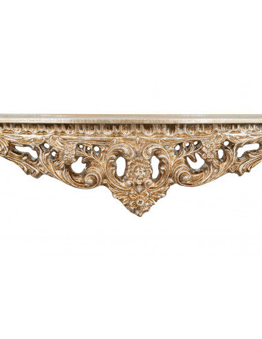Конзола с размери дължина 115 см, дълбочина 33 см, височина 87 см, изработена от дърво с покритие от антично сребърно листо. Грижливо обработени и завършени от стари флорентински занаятчии. Идеални за обогатяване и украсяване на всяка среда. Артикулът е изцяло произведен в Италия. Всички измервания се отнасят за максималния размер на артикула.