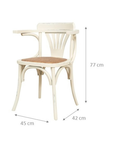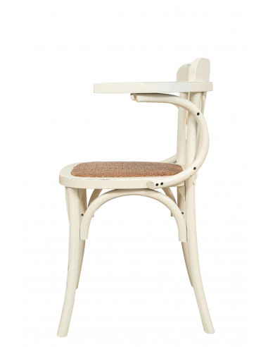 Стол с подлакътници L45xPR42xH77 cm в стил "Тонет", изработен от масивен ясен, с кръстосана облегалка и седалка от плетени ратанови влакна. Благодарение на своя дизайн тип "бистро" той е идеален за обзавеждане във винтидж стил на всяка среда или стая, без да се отказва от комфорта.