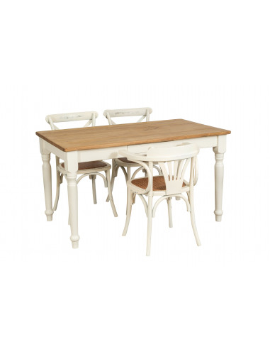 Двуцветна маса от масивно варово дърво с две странични разширения, които могат да се комбинират с всеки селски декор.