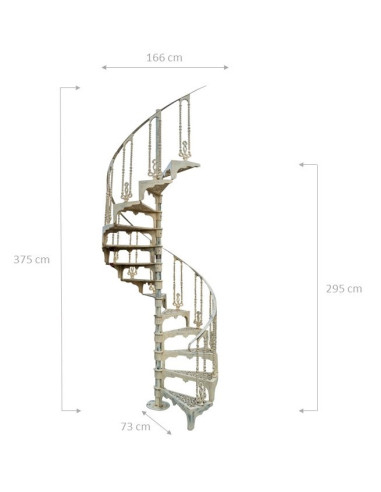 Много стабилна, здрава и тежка вита стълба от чугун с размери обща ширина 166 см, ширина на стъпалото 92 см, обща дълбочина 100 см, височина на последното стъпало 295 см, обща височина 375 см, с точен завършек изцяло ръчна изработка, постигайки наистина античен ефект. Тъй като това са ръчно изработени покрития, покритието може да не отговаря вярно на снимките, като включва и части от естествена ръжда, които правят всеки артикул уникален.