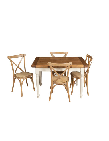 Стол с размери ширина 42 см, дълбочина 44 см, височина 88 см в стил Тонет, изработен от масивен ясен, с кръстосана облегалка. Благодарение на бистро дизайна си той е идеален за обзавеждане на всяка стая или място във винтидж стил, без да се жертва комфортът. Височината от пода до седалката е 46 см.