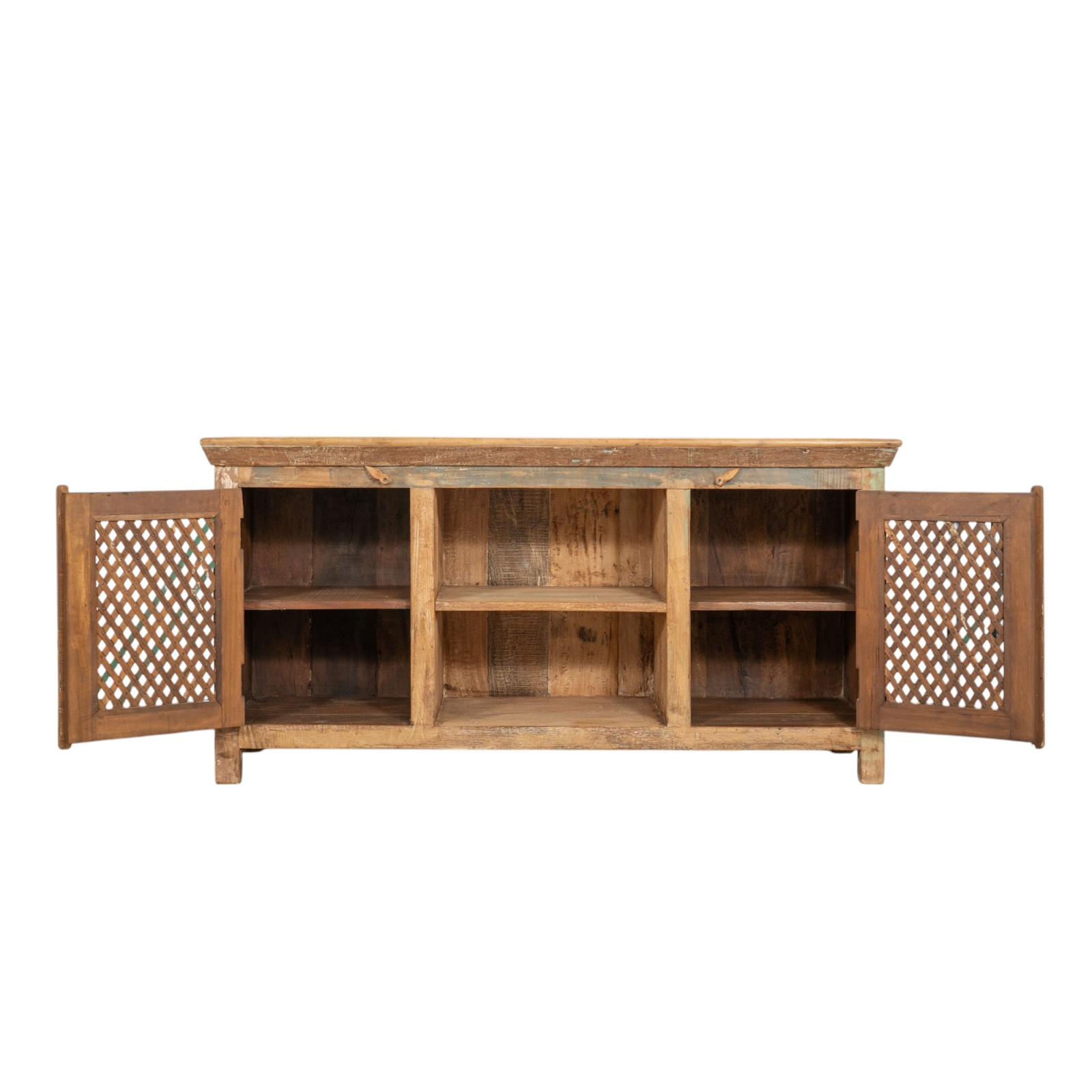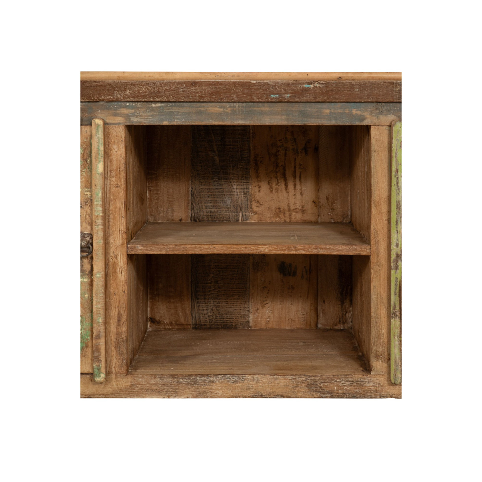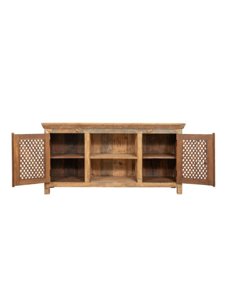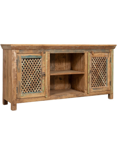 Креденц от масивно рециклирано дърво с размери ширина 153 см, дълбочина 40 см, височина 76 см. Ръчно боядисан с естествени бои, многобройните нюанси правят всеки мебел уникален. Здрав и функционален, той е идеален за любителите на антични мебели и дърво.