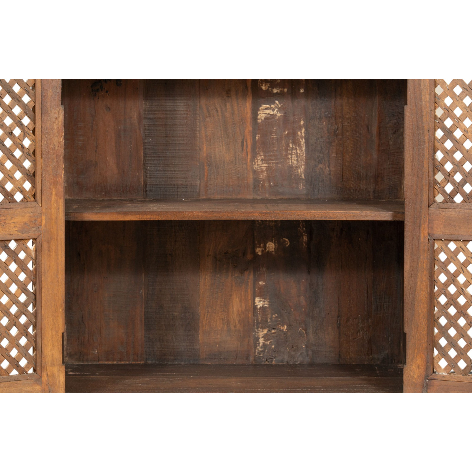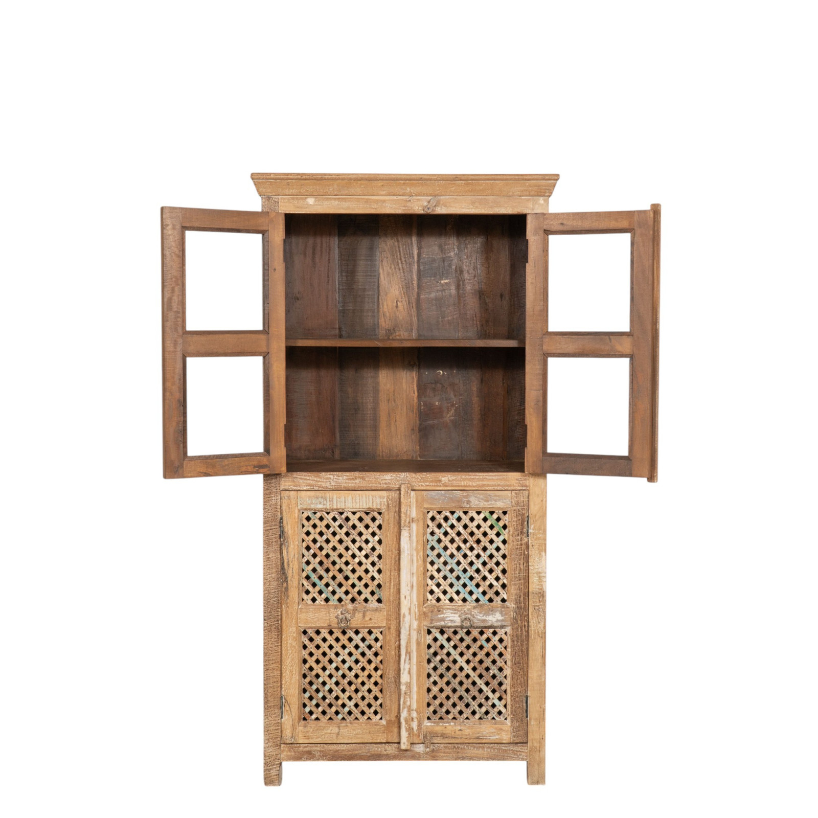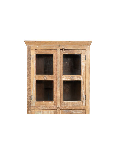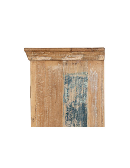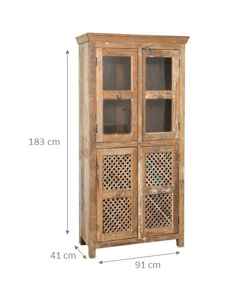 Витрина, изработена от масивно рециклирано дърво с размери ширина 91 см, дълбочина 41 см, височина 183 см. Ръчно боядисана с естествени бои, многобройните нюанси правят мебелта уникална. Здрава и функционална, тя е идеална за любителите на антични мебели и дърво.