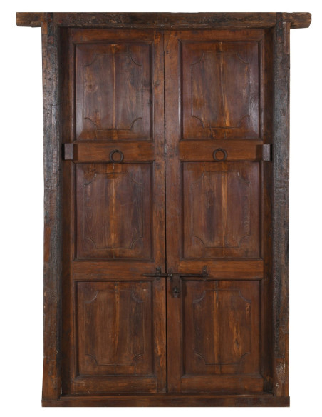 Старинна врата/порта от масивно тиково дърво с размери дължина 160 см, дълбочина 10 см, височина 214 см. Тази врата е получена от разрушени и възстановени старинни и важни сгради. Фино реставрирана и обработена за външна употреба, всяка врата е истинска и уникална антикварна вещ. Всички размери се отнасят до максималните размери на артикула.