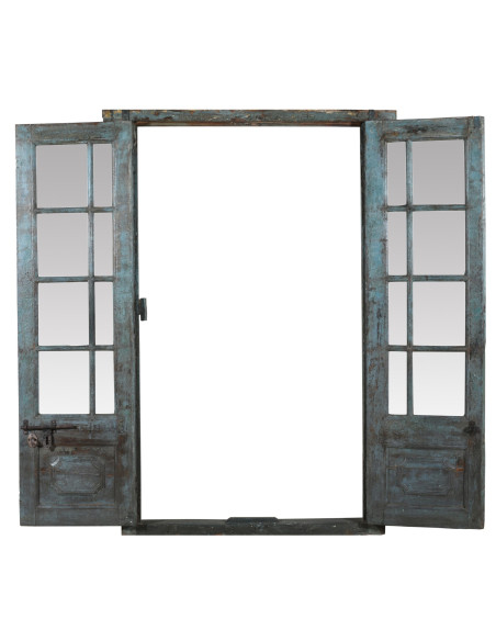 Alte mittelalterliche Tür aus Massivholz und Eisen für den Innen- oder Außenbereich mit Rahmen und Glas