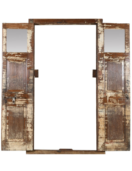 Alte mittelalterliche Tür aus Massivholz und Eisen für den Innen- oder Außenbereich mit Rahmen und Glas