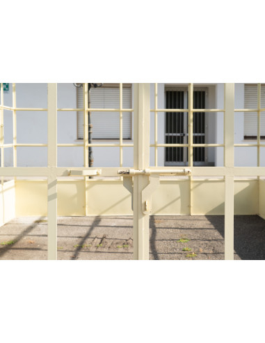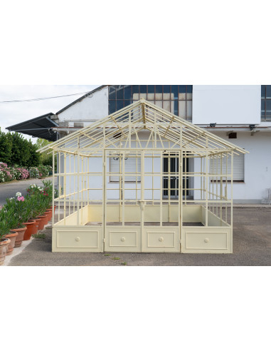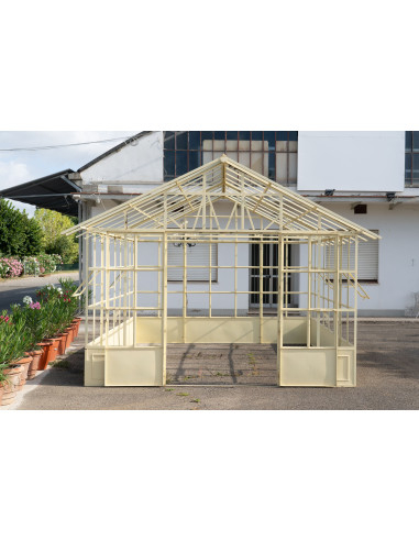 Sehr solides und stabiles Gewächshaus aus robustem Eisenrohr, 350 cm breit, 400 cm tief, 296 cm hoch, im Antik-Look mit zerkratzten und absichtlich abgetragenen Teilen, um ihm ein lebendiges Aussehen zu verleihen. Für die Aufstellung dieses Gewächshauses ist keine kommunale Genehmigung erforderlich. Alle Maße beziehen sich auf die maximalen Gesamtabmessungen des Artikels.