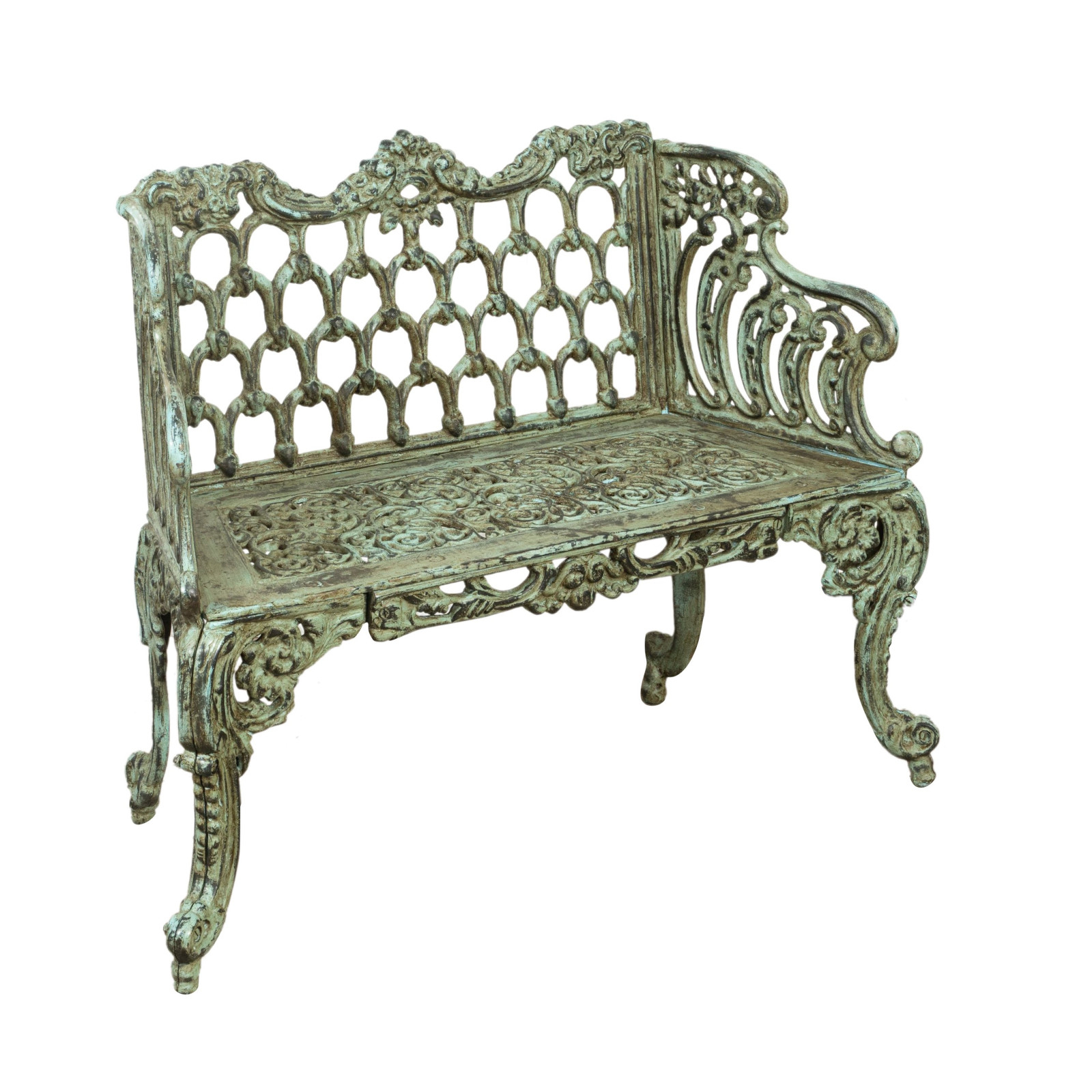 Sehr robuste, stabile und schwere Gusseisenbank mit den Maßen 112 cm Breite, 48 cm Tiefe und 89 cm Höhe, mit einer sorgfältig gearbeiteten Oberfläche, die einen authentischen Antik-Effekt erzielt. In sorgfältiger Handarbeit wurde das Design der alten englischen und französischen Bänke des 19. Jahrhunderts nachempfunden. Elegantes Mobiliar für jeden Innen- und Außenbereich. Alle Maße beziehen sich auf die maximale Größe des Artikels.