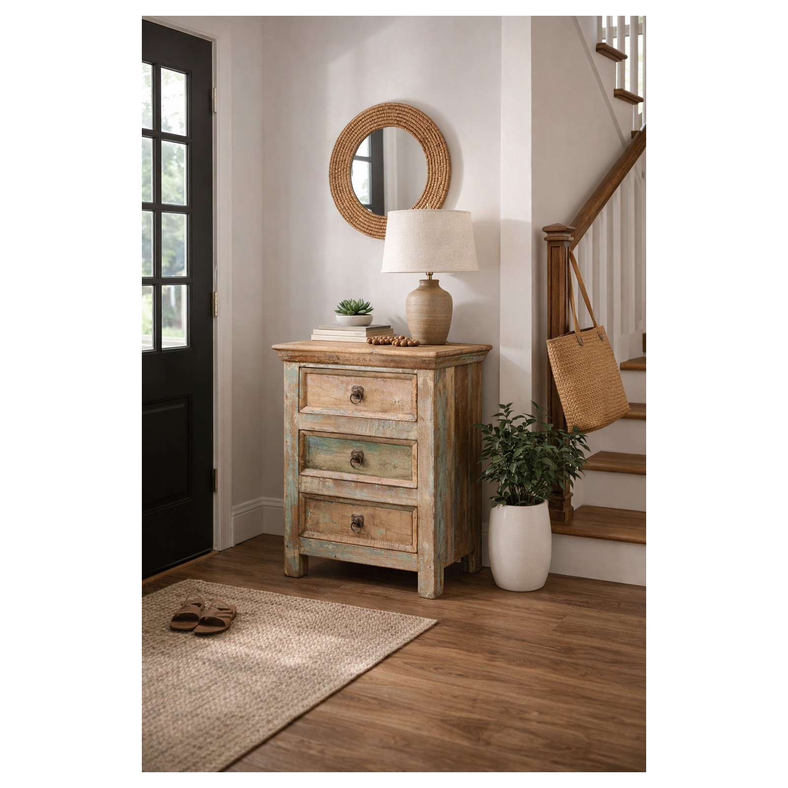 Nachttisch mit 3 Schubladen aus recyceltem Massivholz mit den Maßen Breite 55 cm, Tiefe 38 cm, Höhe 71 cm. Handbemalt mit natürlichen Lacken, die vielfältigen Farbtöne machen jedes Möbelstück zu einem Unikat. Solide und funktional, ideal für Liebhaber von antiken Möbeln und Holz.
