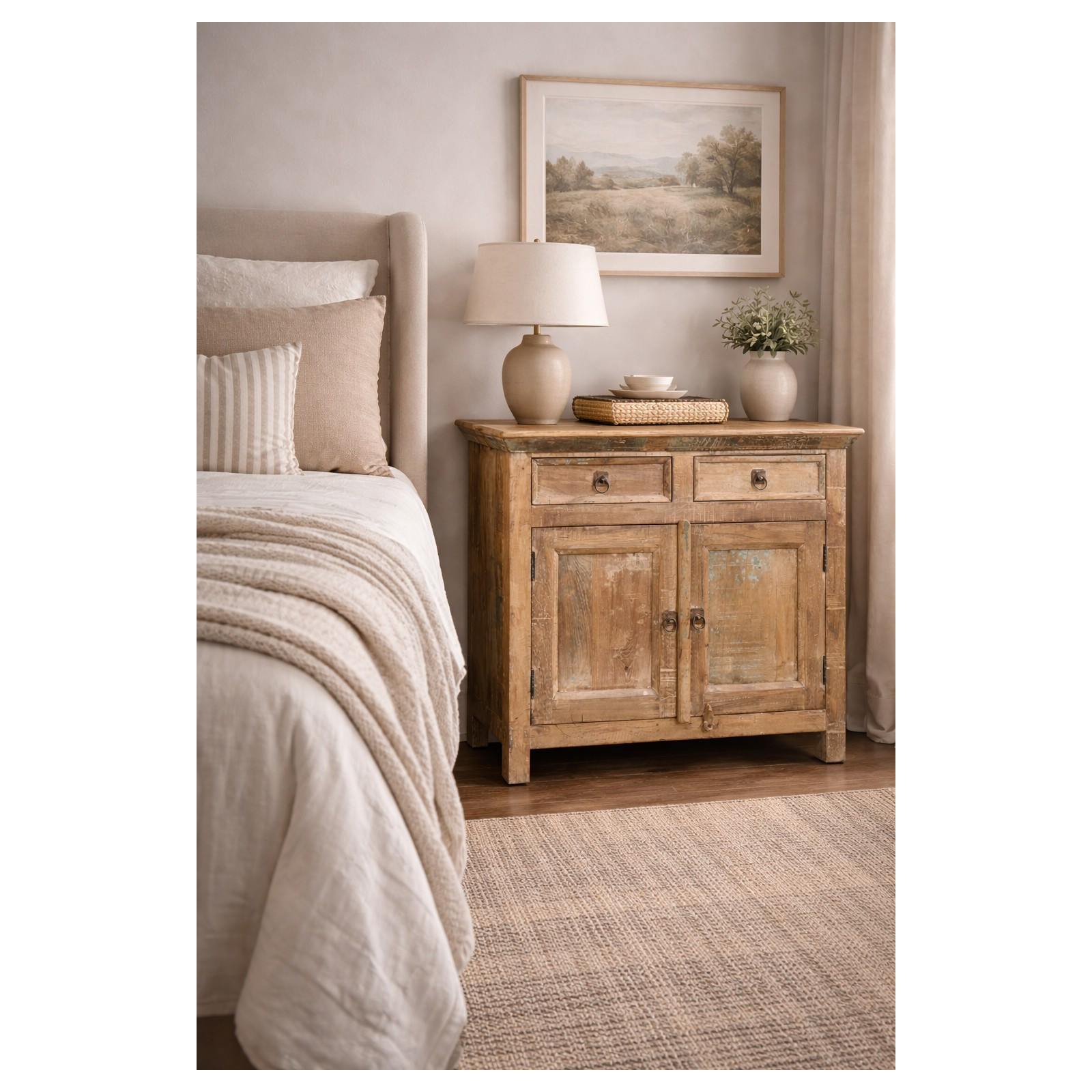 Solider und vielseitiger Sideboard aus recyceltem Massivholz. Handbemalt mit natürlichen Farben, machen die vielfältigen Farbtöne jedes Möbelstück zu einem Unikat. Mit großen geschlossenen Ablageflächen mit 2 Türen und 2 Schubladen in der Mitte. Mit den Maßen L94xT38xH84 cm fügt es sich problemlos in jede Umgebung ein. Ideal für Liebhaber von antiken Möbeln und Holz.