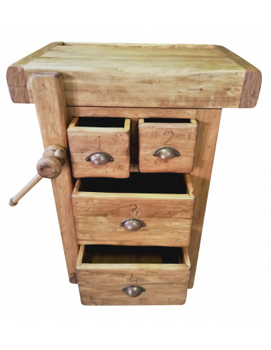 Workbench entirely handmade of solid linden wood, dimensions 64 cm long, 57 cm deep, 84 cm high. Thanks to the wise and scrupulous craftsmanship Made in Italy, the working vice and the attention to detail, the bench is a faithful replica of the old traditional carpenters' counters. Equipped with four drawers, the table is proposed as a versatile and exclusive element of furniture capable of giving a touch of originality to any environment.