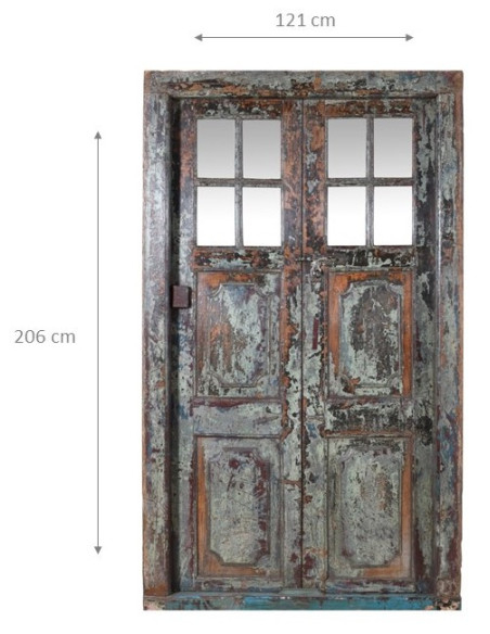 Antique solid teak door measuring 121 cm in length, 10 cm in depth and 206 cm in height. This door comes from the demolition and restoration of ancient and important buildings. Finely restored and treated for outdoor use, each door is a genuine and unique antique piece. All measurements refer to the maximum dimensions of the item.