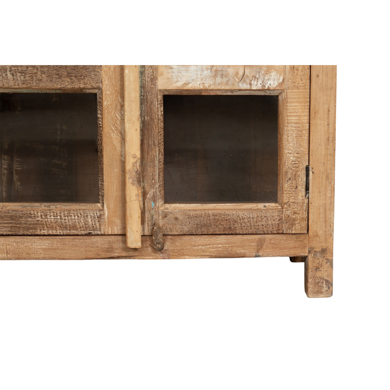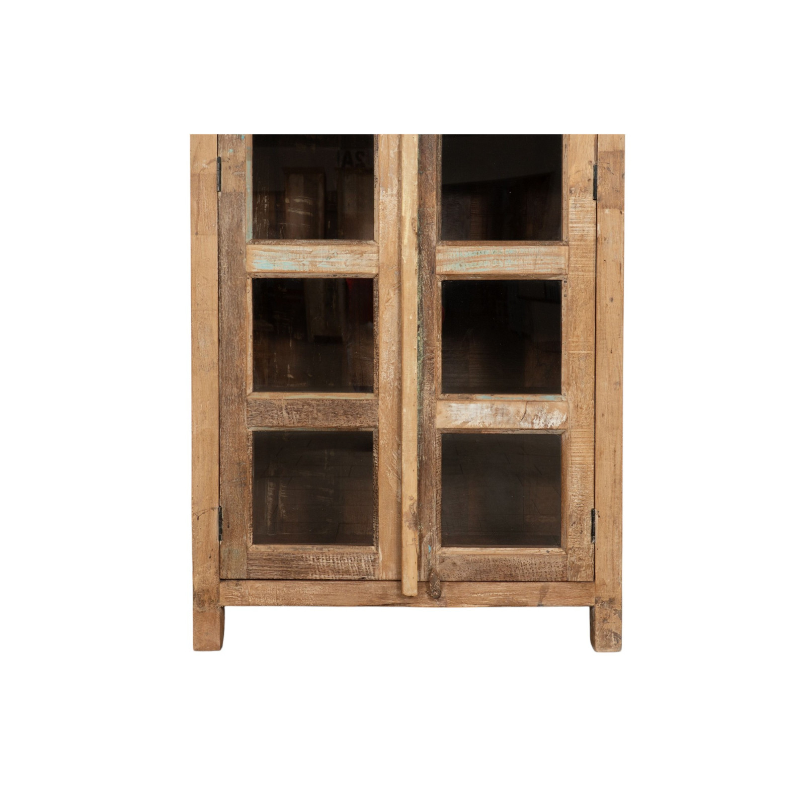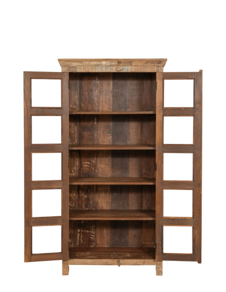 Display cabinet made from reclaimed solid wood, measuring 91 cm wide, 41 cm deep and 183 cm high. Hand-painted with natural paints, the multiple shades make this piece of furniture unique. Solid and functional, it is ideal for lovers of antique furniture and wood.
