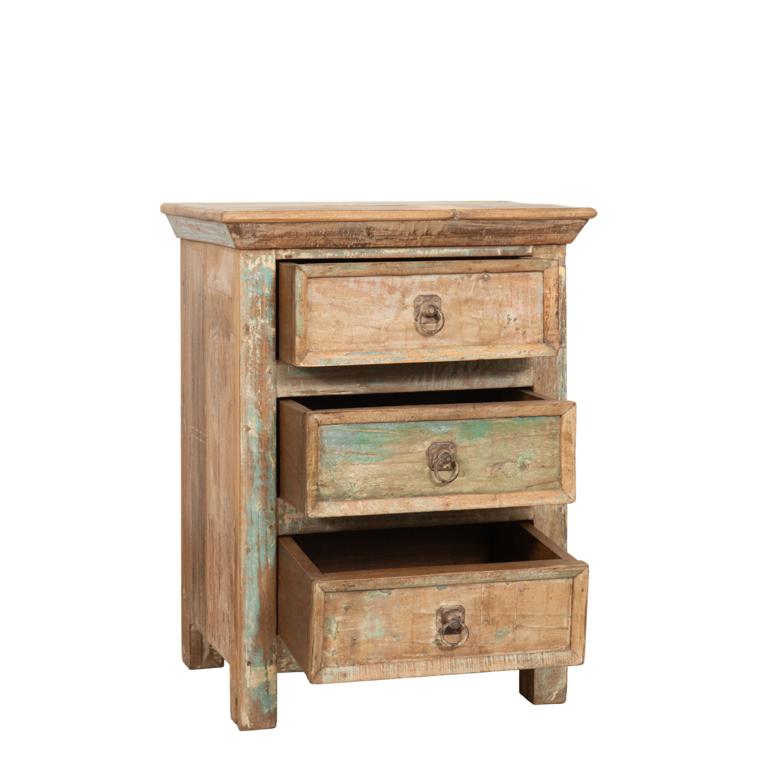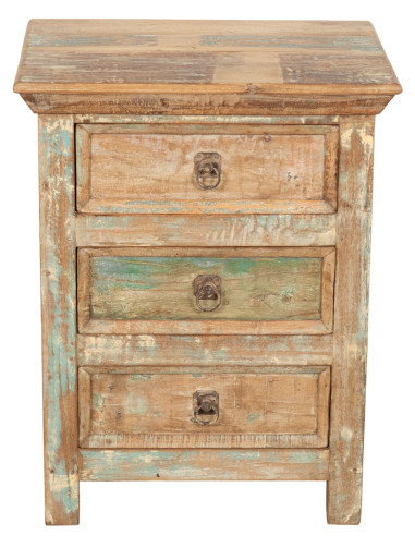 Bedside table with 3 drawers made of reclaimed solid wood, measuring 55 cm wide, 38 cm deep and 71 cm high. Hand-painted with natural paints, the multiple shades make each piece of furniture unique. Solid and functional, it is ideal for lovers of antique furniture and wood.