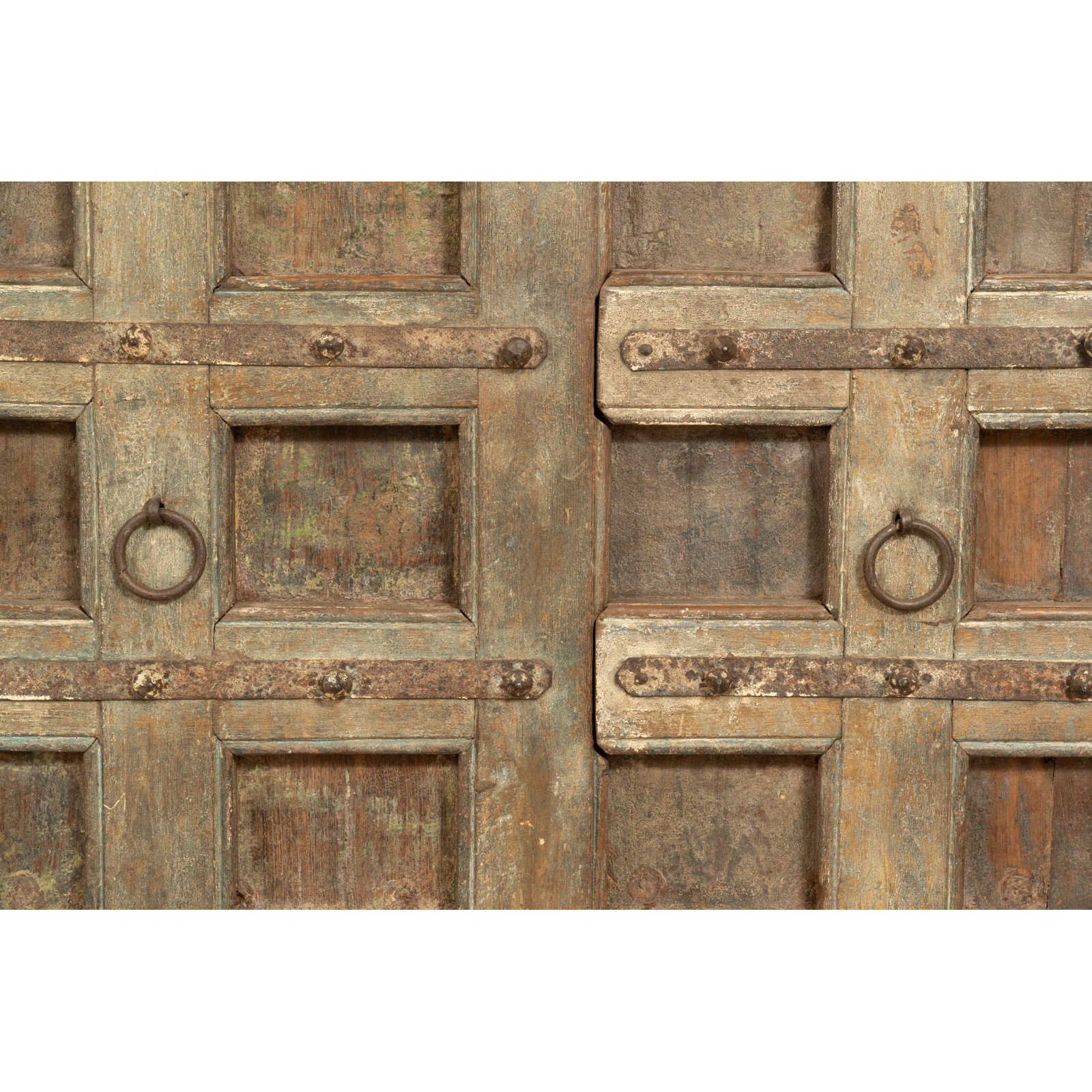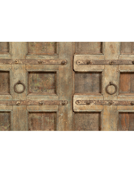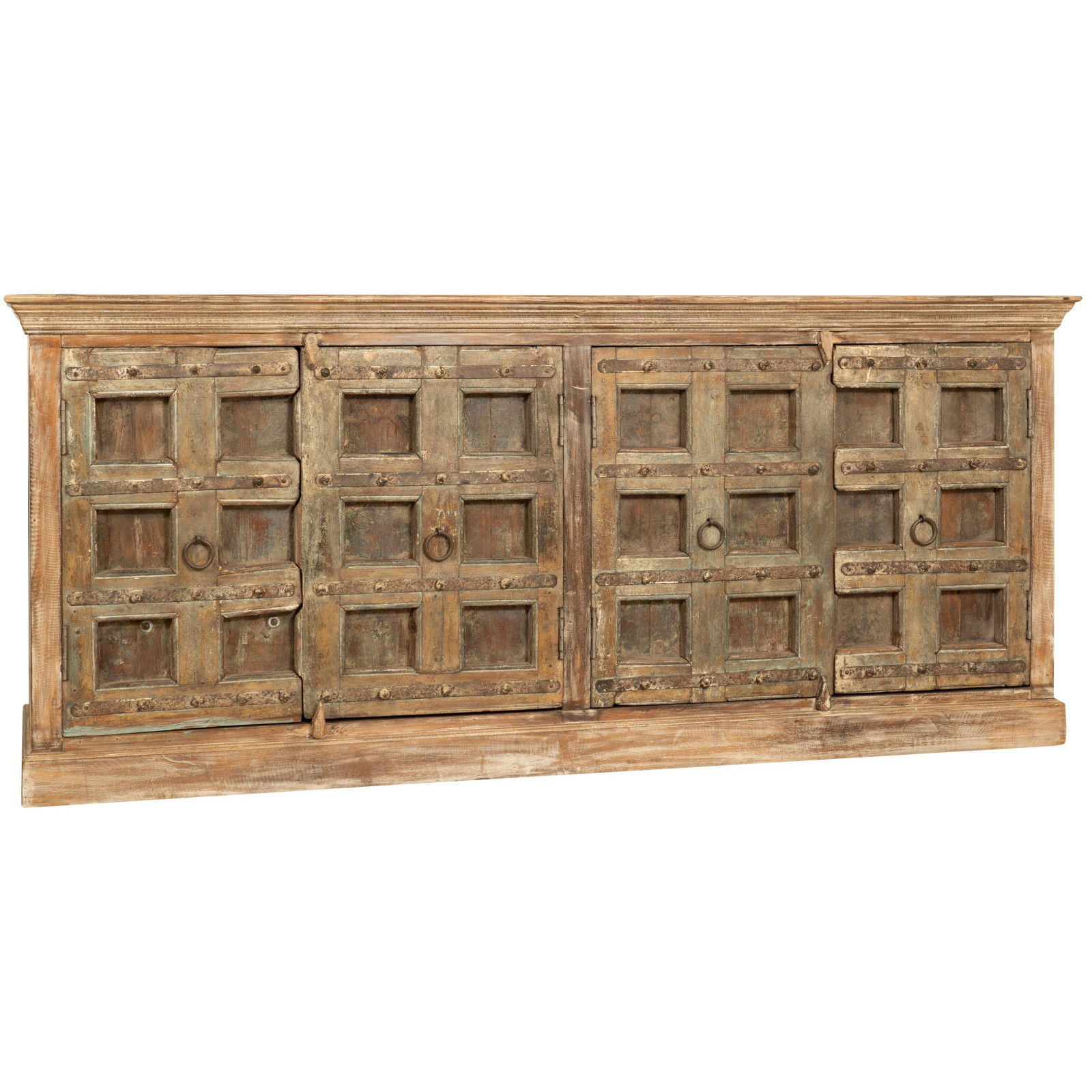 Solid and versatile sideboard made of reclaimed solid wood. Hand-painted with natural paints, the multiple shades make each piece of furniture unique. It has large closed shelves. Measuring L224xD51xH90 cm, it fits easily into any room. Ideal for lovers of antique furniture and wood.