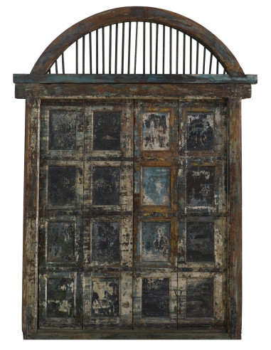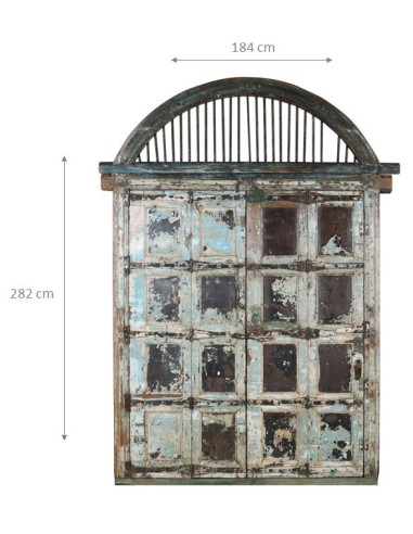 Antique solid teak door measuring 184 cm in length, 10 cm in depth and 282 cm in height. This door comes from the demolition and restoration of ancient and important buildings. Finely restored and treated for outdoor use, each door is a genuine and unique antique piece. All measurements refer to the maximum dimensions of the item.