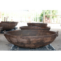 Old container / crucible of dimensions diameter 180 cm, height 45 cm. Made of wrought iron, worked entirely by hand, it can also be used as an original barbecue, brazier, planter, water lily basin... or as a simple decoration. All measurements refer to the maximum size of the article.