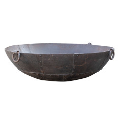 Old container / crucible with a diameter of 177 cm, height 52 cm. Made of wrought iron, worked entirely by hand, it can also be used as an original barbecue, brazier, planter, basin for water lilies ... or as a simple decoration. All measurements refer to the maximum size of the article.