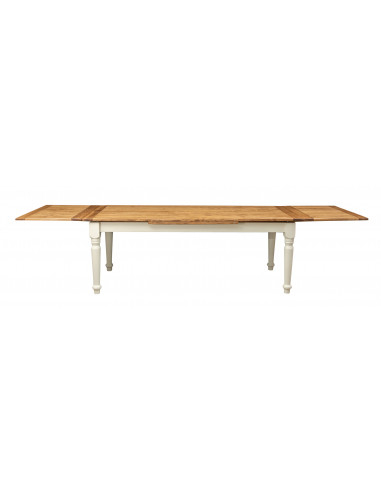 Country-style solid lime wood antiqued white frame natural top W220xDP100xH80 cm sized extensible table. Made in Italy