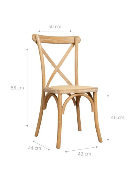 Chair with dimensions width 42 cm, depth 44 cm, height 88 cm in Thonet style made of solid ash with crossed backrest. Thanks to its bistro design, it is ideal for furnishing any room or venue in vintage style, without sacrificing comfort. The height from the floor to the seat is 46 cm.