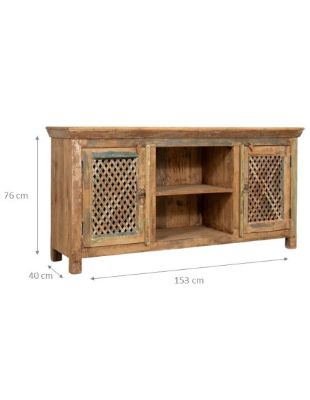 Sideboard made of reclaimed solid wood, measuring 153 cm wide, 40 cm deep and 76 cm high. Hand-painted with natural paints, the multiple shades make each piece of furniture unique. Solid and functional, it is ideal for lovers of antique furniture and wood.