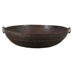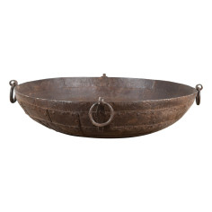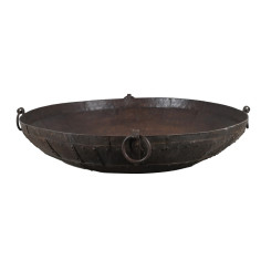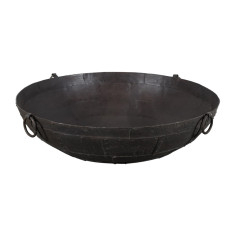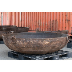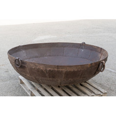 Old container/crucible measuring 170 cm in diameter and 44 cm in height. Made of wrought iron and entirely handcrafted, it can also be used as an original barbecue, brazier, planter, water lily pond... or simply as a decoration. All measurements refer to the maximum dimensions of the item.