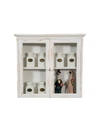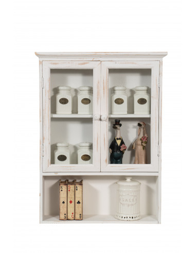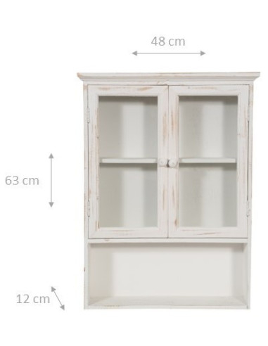 Wooden display cabinet in antique white finish, dimensions 48 cm length, 12 cm depth, 63 cm height, shabby style. All measurements refer to the maximum size of the article