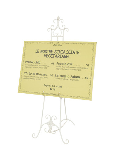 Elegant practical and stable tripod W53xDP96xH150 cm sized wrought iron made panel frame . Attentive to detail, due to its versatility, it is also ideal as a menu or for exhibitions, showcases, galleries ?