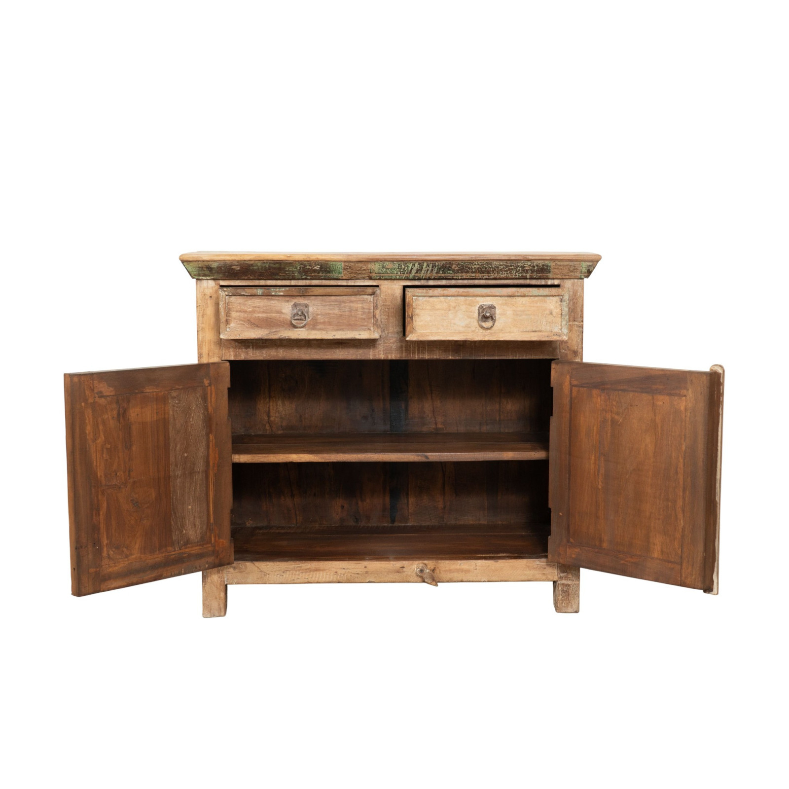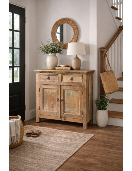 Aparador sólido y versátil fabricado en madera maciza recuperada. Pintado a mano con barnices naturales, los múltiples matices hacen que cada mueble sea una pieza única. Presenta amplias superficies cerradas con 2 puertas y 2 cajones centrales. Con unas dimensiones de 94 x 38 x 84 cm, se integra fácilmente en cualquier ambiente. Ideal para los amantes de los muebles antiguos y la madera.