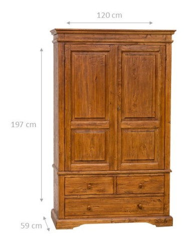 Sólido y robusto armario estilo Country completamente hecho de madera maciza de tilo, fruto de una cuidadosa artesanía Made in Italy. De dimensiones 120 x 59 x 197 cm, está equipado con una repisa espaciosa con puertas dobles y una percha. En la parte inferior hay 3 cajones amplios, construidas con las juntas de cola de milano y las perillas de madera.