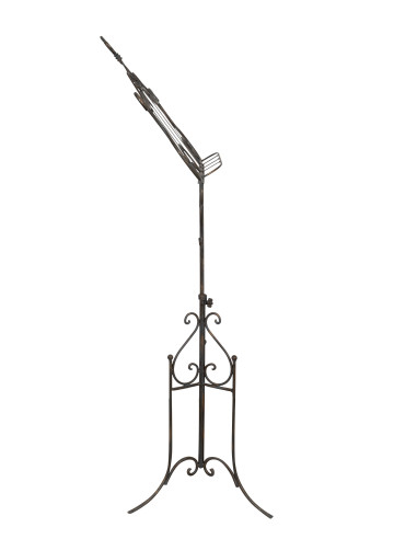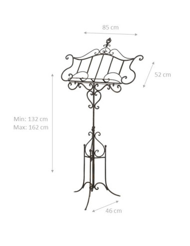 Práctico y muy estable atril de pie L85xPR46xH140 cm de hierro forjado macizo. Regulable en altura desde un mínimo de 132 cm hasta un máximo de 162 cm, es un mueble versátil y elegante. También es muy adecuado como soporte de menús para restaurantes.Todas las medidas se refieren al tamaño máximo del artículo.