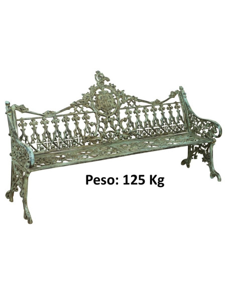 Banco muy robusto, estable y pesado fabricado en hierro fundido con unas dimensiones de 180 cm de ancho, 65 cm de profundidad y 100 cm de altura, con un cuidado acabado totalmente artesanal, consiguiendo un auténtico efecto envejecido. Elaborado meticulosamente, reproduce el diseño de los antiguos bancos ingleses y franceses del siglo XIX. Amuebla con elegancia cualquier ambiente interior o exterior. Todas las medidas se refieren al tamaño máximo del artículo.