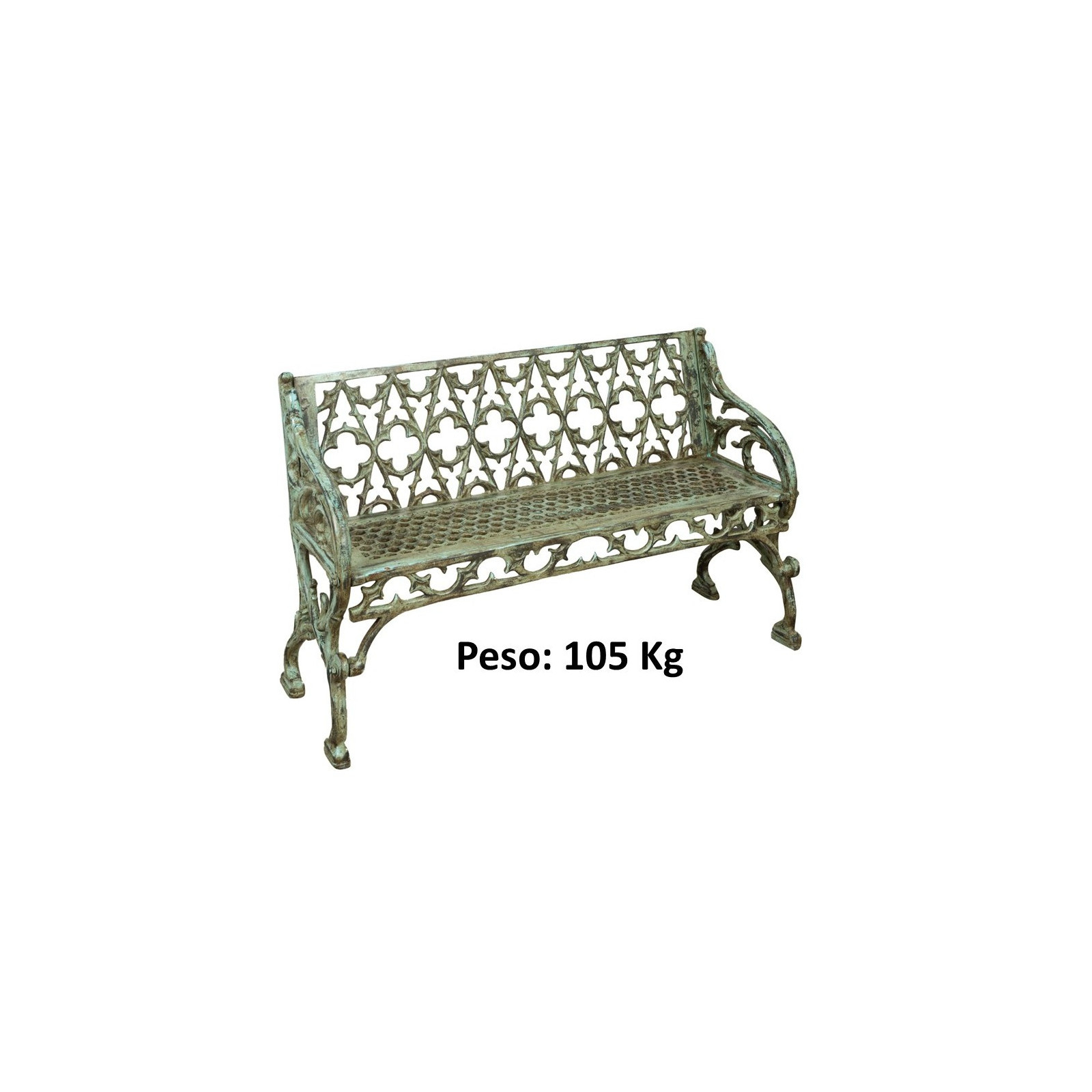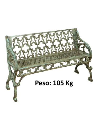 Banco muy robusto, estable y pesado fabricado en hierro fundido con unas dimensiones de 130 cm de ancho, 47 cm de profundidad y 79 cm de altura, con un cuidado acabado totalmente artesanal, consiguiendo un auténtico efecto envejecido. Elaborado meticulosamente, reproduce el diseño de los antiguos bancos ingleses y franceses del siglo XIX. Amuebla con elegancia cualquier ambiente interior o exterior. Todas las medidas se refieren al tamaño máximo del artículo.