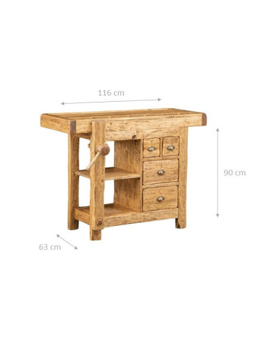 Medidas: largo 119 cm ancho 63 cm alto 90 cm- Material: madera- Banco de trabajo rústico en madera maciza de tilo acabado natural. El banco es una réplica fiel de los antiguos bancos de carpintero tradicionales. Fabricado a mano en Italia, es preciso hasta el más mínimo detalle con cuatro cajones con un tornillo que funciona. Esta mesa de carpintero se propone como un mueble versátil y exclusivo capaz de dar un toque de originalidad a cualquier ambiente, fácil de insertar en una decoración Country, gracias a su eclecticismo, es un elegante banco de trabajo ideal tanto para la cocina como para la decoración del hogar. Todas las medidas se refieren al tamaño máximo del artículo.