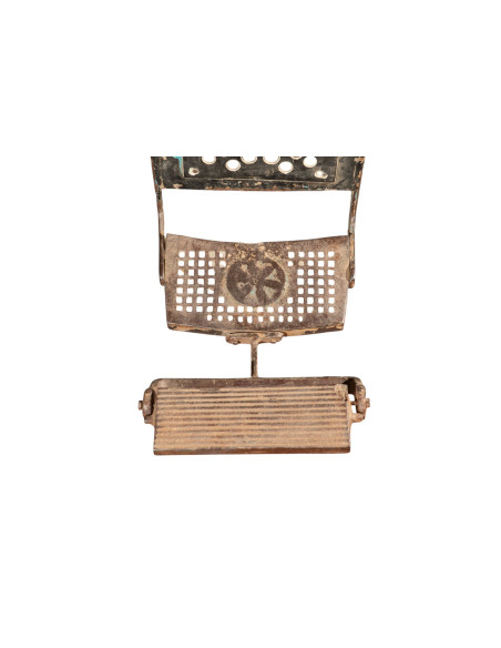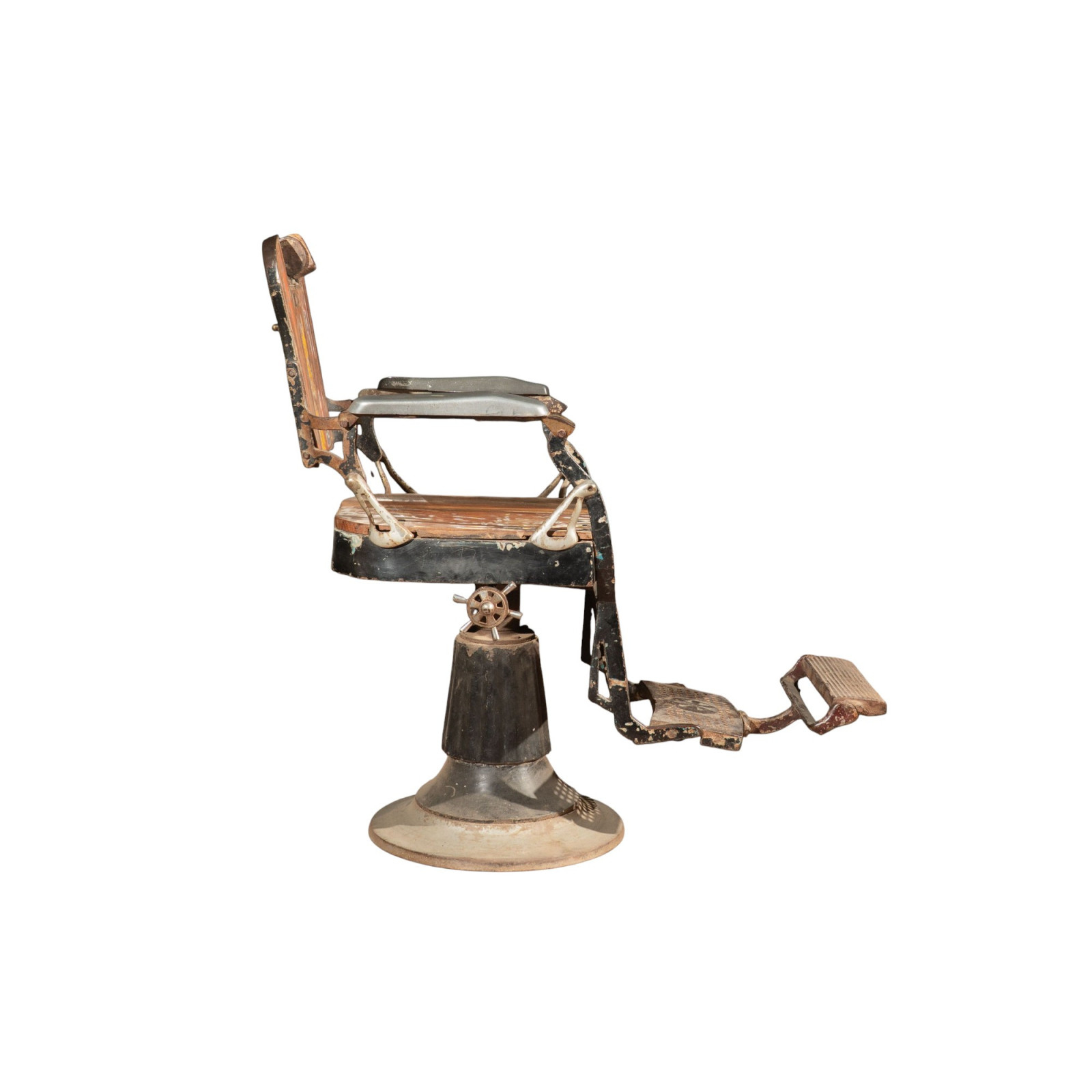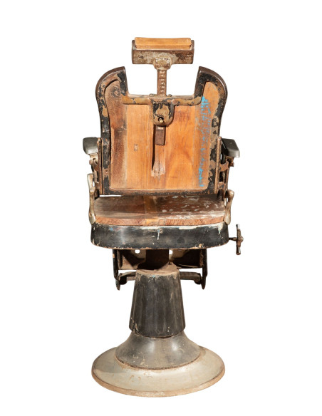 Antiguo sillón de barbero con unas dimensiones de 78 cm de largo, 56 cm de profundidad y 113 cm de alto. Este sillón es un sillón original del siglo XIX finamente restaurado en hierro y fundición, con el asiento y el respaldo revestidos de madera.
