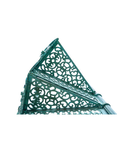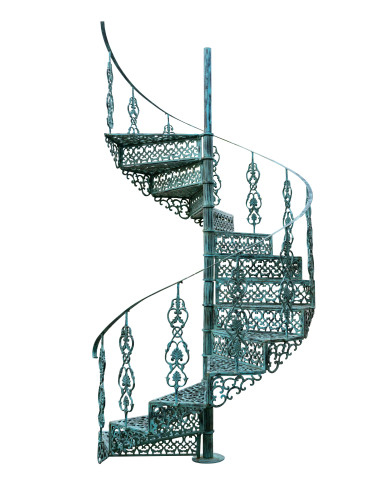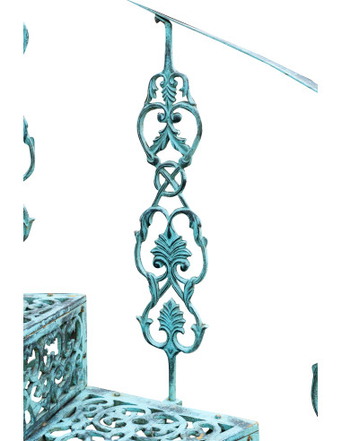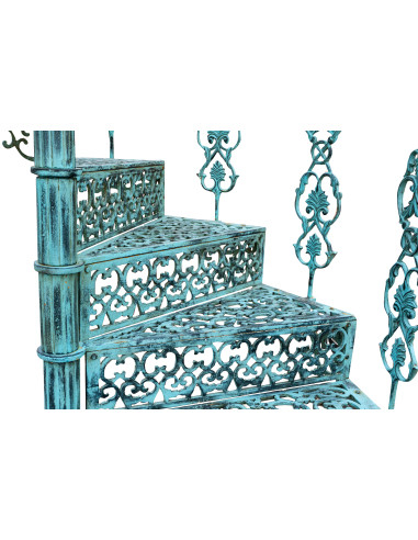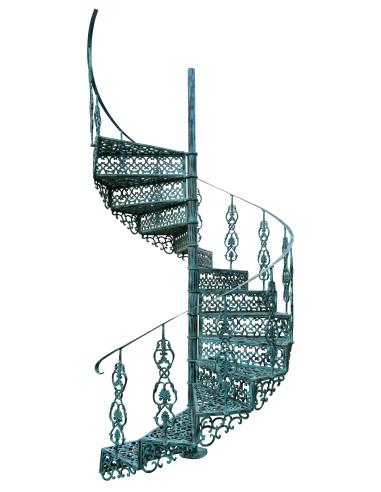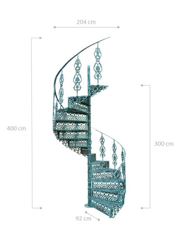 Escalera de caracol de hierro fundido muy estable, robusta y pesada con unas dimensiones ancho total 204 cm, ancho de peldaño 92 cm, fondo 100 cm, altura del último peldaño 300 cm, alto total 400 cm, con un cuidado acabado completamente realizado a mano, obteniendo un efecto verdaderamente antiguo. Al tratarse de acabados artesanales, el acabado puede no corresponderse fielmente con las fotografías, presentando además piezas de óxido natural que hacen de cada artículo una pieza única.