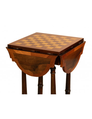 Mesita contrachapada de raiz de nogal. Se presenta con tablero de ajedrez. Ideal para el juego de damas y ajedrez. Dimensiones 81 cm de anchura por 81 cm de profundidad por 78 m de altura.