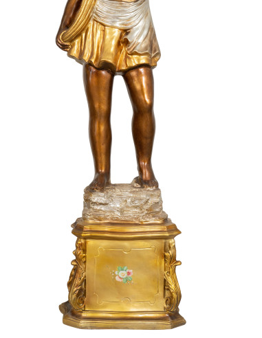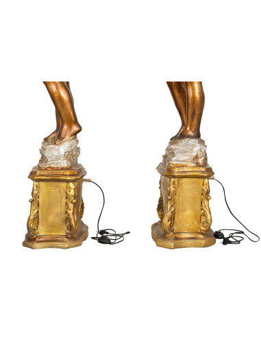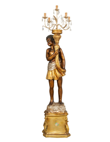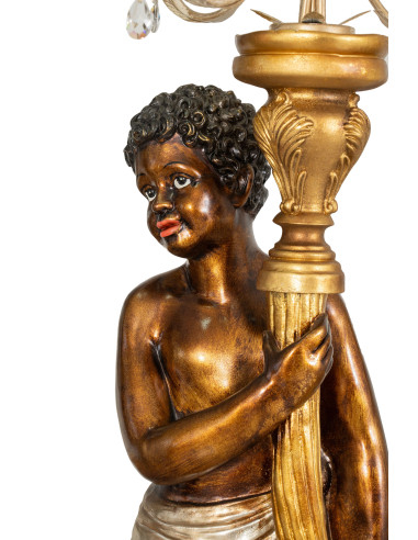 Pareja de moros con lámpara de araña con dimensiones ancho 40 cm, fondo 40 cm, alto 190 cm cada uno. Todas las medidas se refieren al tamaño máximo del artículo.