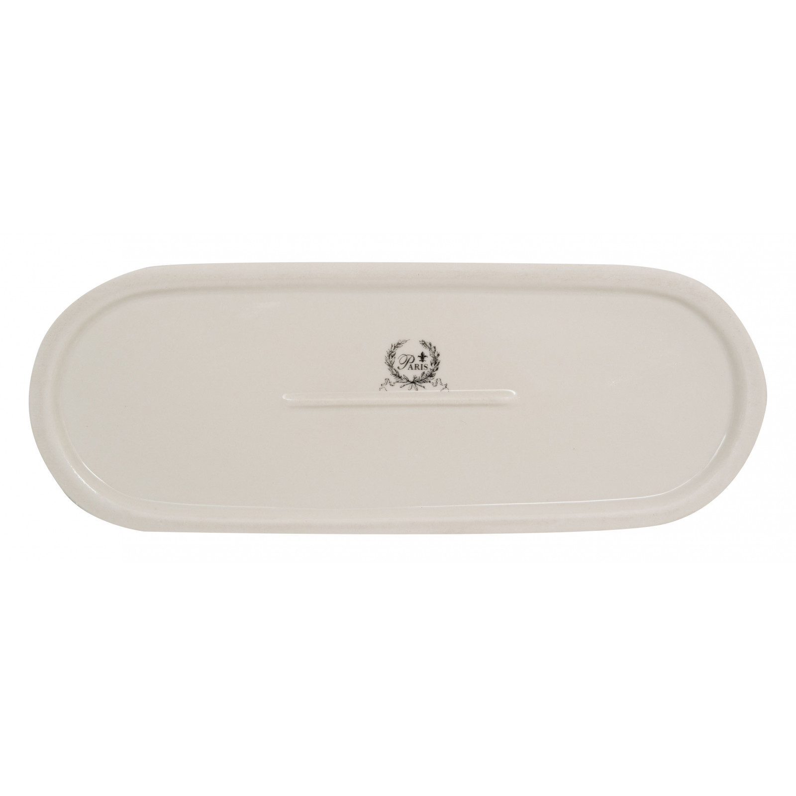 Set de baño de fina porcelana blanca con adornos compuesto por: bandeja multifunción para usar como jabonera o vaciabolsillos (25x10x3 cm), soporte para cepillos de dientes (7x7x11 cm), dispensador de jabón líquido (7x7x21 cm) y recipiente cilíndrico multifunción (7x7x11 cm).