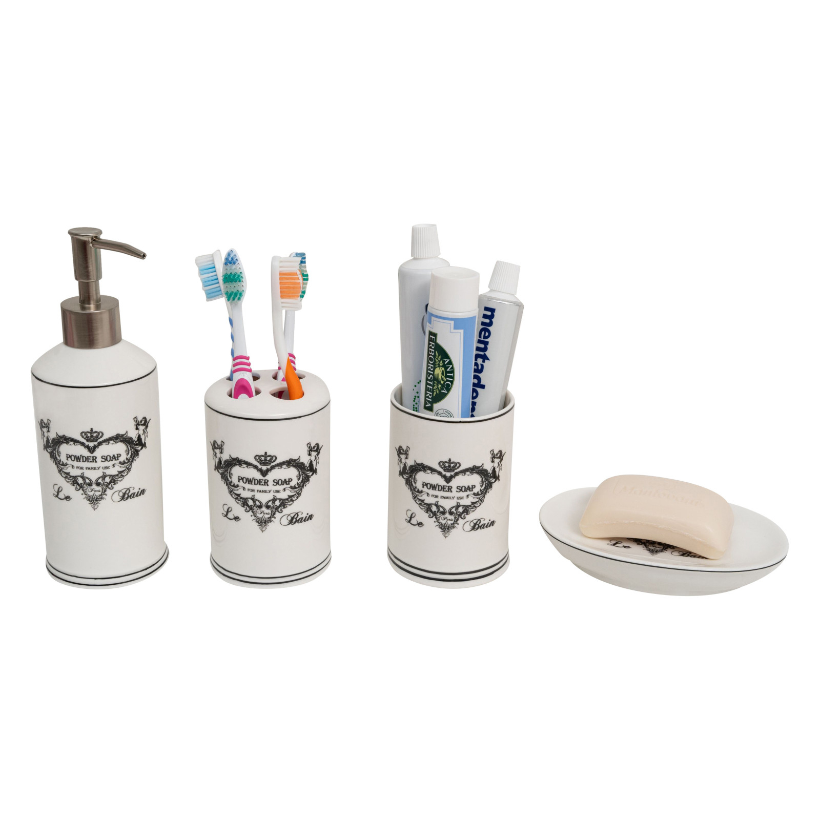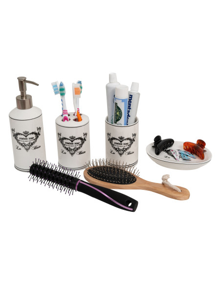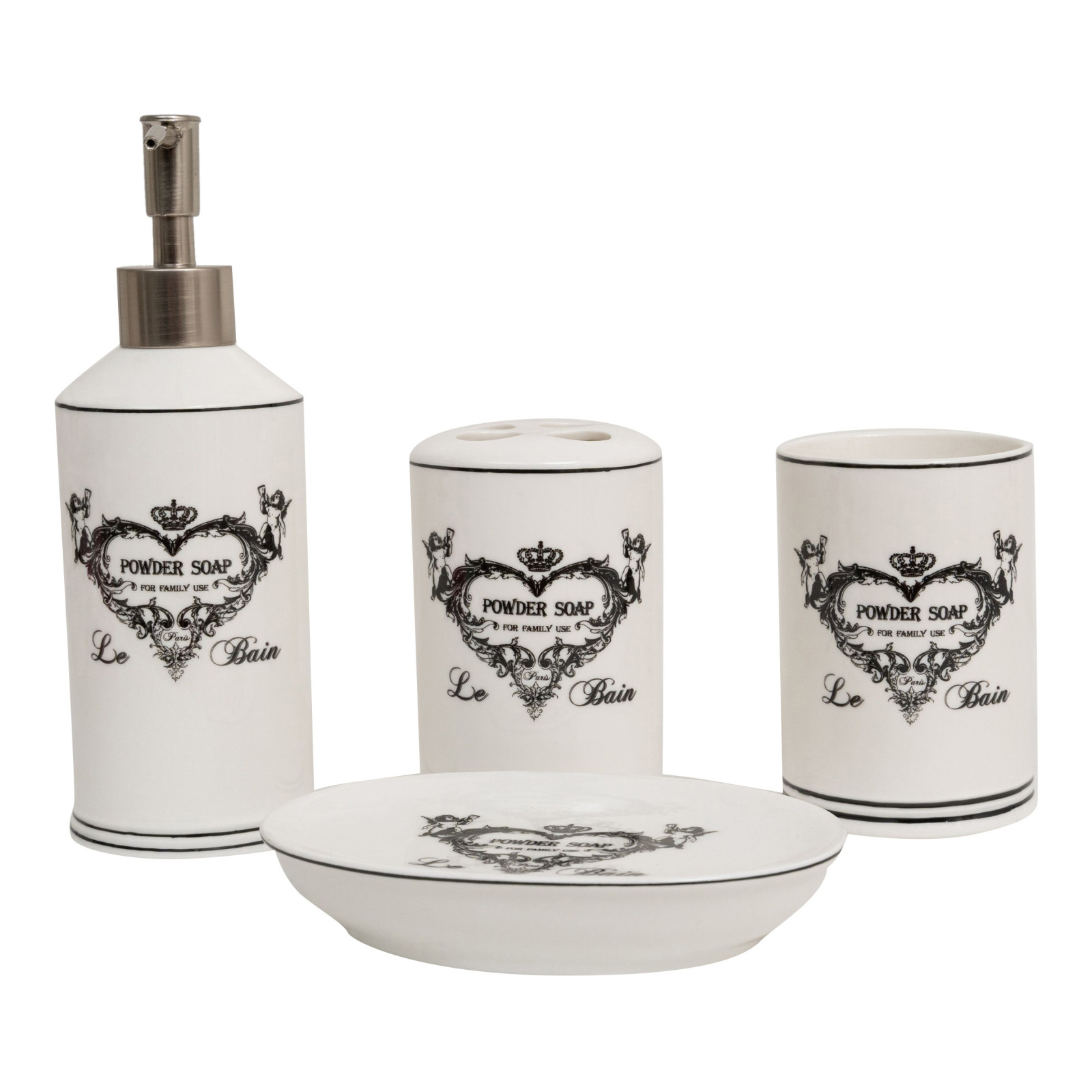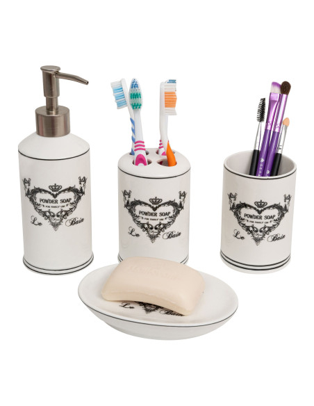 Set baño "Jabones Superfinos" 4 piezas de porcelana blanca decorada L25xPR10xH21 cm