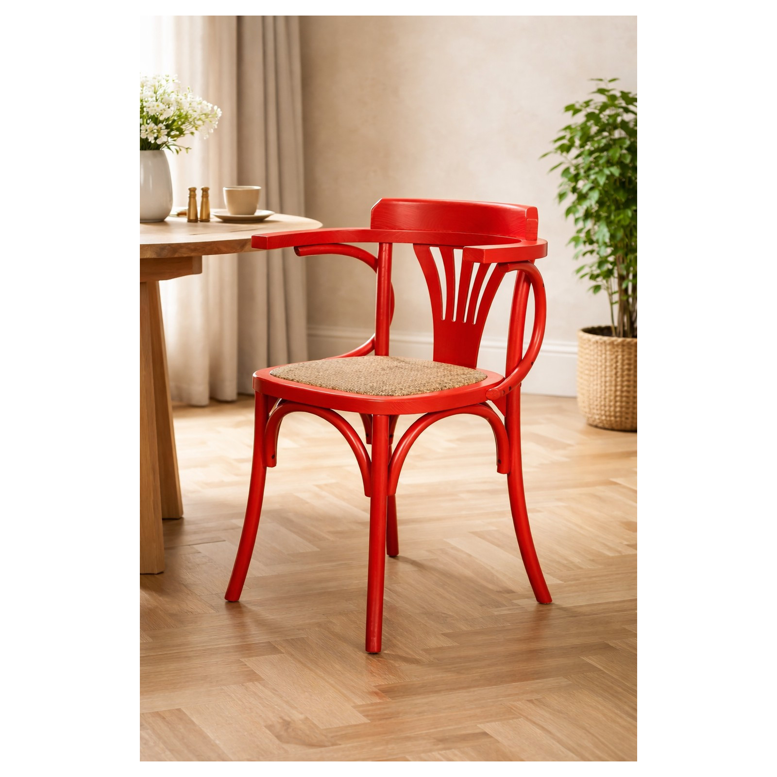 Silla con reposabrazos Thonet de madera maciza de fresno con acabado rojo y asiento de ratán.