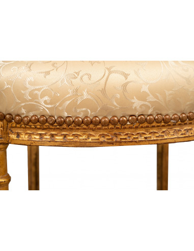 Silla francesa de estilo Luis XVI, en madera de haya maciza, tallada y acabada a mano con pátina de pan de oro, 41 cm de largo, 35.5 cm de profundidad, 97 cm de altura. Asiento tapizado a mano.Todas las medidas se refieren al tamaño màximo del artículo