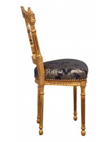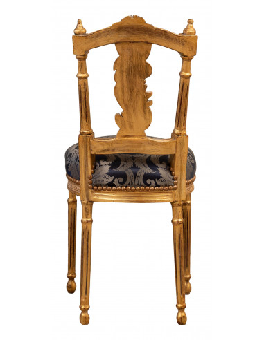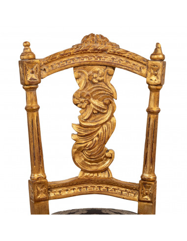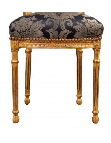 Silla francesa de estilo Luis XVI, en madera de haya maciza, tallada y acabada a mano con pátina de pan de oro, tamaño 40 cm de largo, 46 cm de profundidad, 92 cm de altura. Asiento tapizado a mano.Todas las medidas se refieren al tamaño màximo del artículo