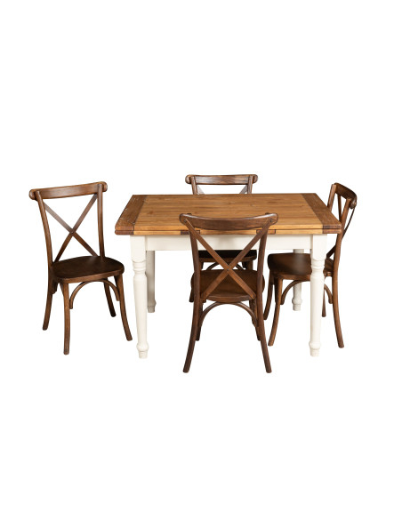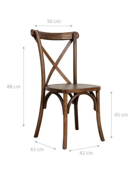 Silla de dimensiones anchura 42 cm, profundidad 43 cm, altura 88 cm de estilo Thonet fabricada en fresno macizo con respaldo cruzado. Gracias a su diseño bistro, es ideal para amueblar cualquier habitación o local en estilo vintage, sin renunciar a la comodidad. La altura desde el suelo hasta el asiento es de 45 cm.