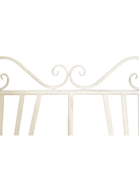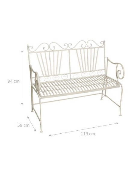 Bancos sofás fabricados en hierro con unas dimensiones de 113 cm de ancho, 58 cm de profundidad y 94 cm de altura, con acabado blanco envejecido. Con su estilo provenzal, decora con funcional elegancia cualquier ambiente, tanto interior como exterior.