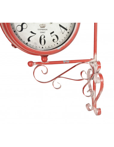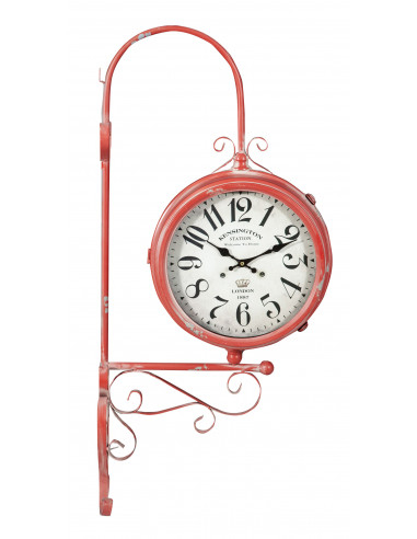 Kaksipuolinen seinäkello, jossa antiikki punainen viimeistely, mitat 46 cm pitkä, 18 cm syvä, 96 cm korkea ja vakaa rautatuki. Suunnittelu muistuttaa vanhoja rautatieaseman kelloja. Kaksi kelloa, jotka ovat helposti saatavilla saranan ansiosta, ovat itsenäisiä, mikä antaa mahdollisuuden merkitä myös kaksi erilaista aikaa. Alkuperäinen lisäys vintage-huonekaluja minkä tahansa tyyppisiin ympäristöihin. Ihanteellinen myös seinähälytyskellona sisä- ja ulkotiloihin, kuten verannat, katokset, huvimajat jne ...