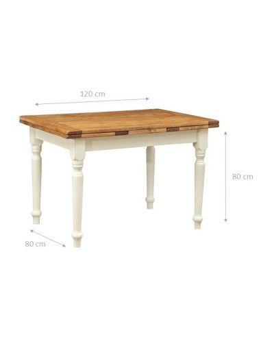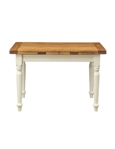 Maan laajennettava pöytä massiivipuusta, vanhana valkoisella rakenteella ja luonnollisella päällä. Valmistettu Italiassa
