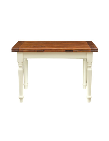 Kaksisävyinen massiivipuusta valmistettu pöytä, jossa on kaksi sivuttaistusta, jotka voidaan yhdistää mihin tahansa maalaismaiseen sisustukseen.